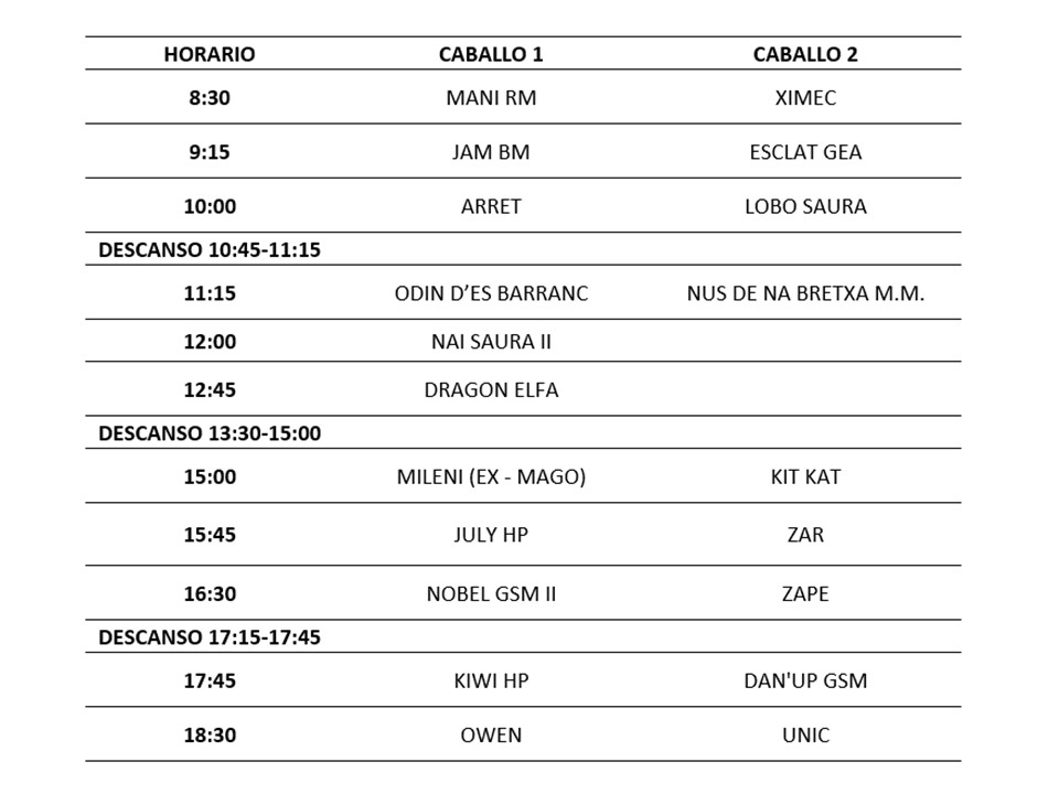 A continuación se detalla el horario previsto para el clinic de Doma Menorquina a cargo del reconocido jinete internacional Lucas Elías Lara que tendrá lugar este fin de semana en Menorca, en sesión matinal en las instalaciones del Club Hípic Sa Creueta (Es Migjorn Gran) y en sesión vespertina en las instalaciones de Escola Eqüestre Menorquina (Ciutadella de Menorca).